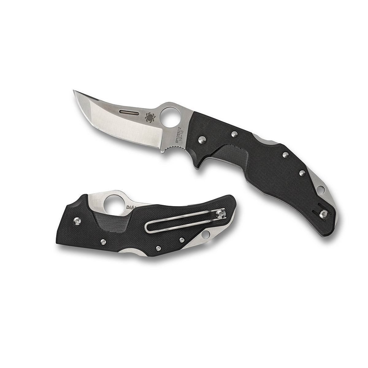 The Battlestation is an extremely stout folding knife built on a framework of solid stainless steel handle liners. They are capped by textured G-10 scales that feature meticulously machined relief cuts for easy access to the blade’s Trademark Round Hole™ when opening the knife. The blade of the Battlestation is a unique hybrid profile that features a slightly curved, Americanized tanto-style point and a strong saber-ground PlainEdge™ cutting edge. Ground from VG-10 stainless steel, it also features twin fullers (grooves) in the blade flats and a beveled swedge at the tip to ensure a strong but capable point. An index-finger choil at the heel of the blade allows the user to choke up for extra control and features carefully machined jimping (textured grooves) for extra grip security. For swift, one-handed opening, the blade includes a 13mm Trademark Round Hole that also unmistakably identifies the Battlestation as a Spyderco design. A reversible wire clip attached to the butt end of the handle supports left or right-side tip-up carry and complements all the other features of the knife to make its carry and operation completely ambidextrous.