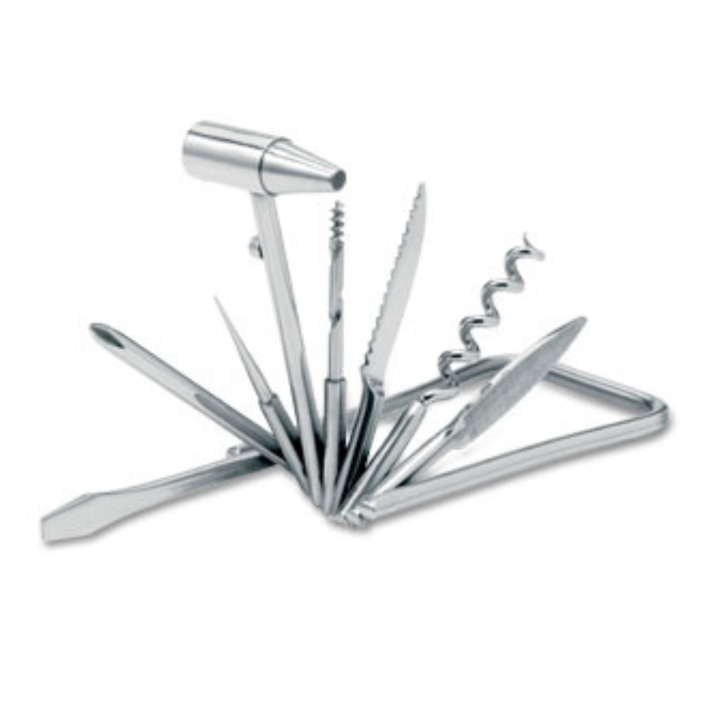It's called a Harp Tool because it's silhouette is evocative of the musical instrument. The byrd Harp has eight functional tools which rotate out individually from an outer ring and snap open, ready for use. Included: a slotted-head and Phillips-head screwdriver, punch/awl, gimlet, saw, corkscrew, file and small/large-head hammer that doubles as a bottle opener. When folded flat the Harp slips into a leather carrying case. It's like having a micro toolbox for your kitchen, car, boat, backpack or bike.