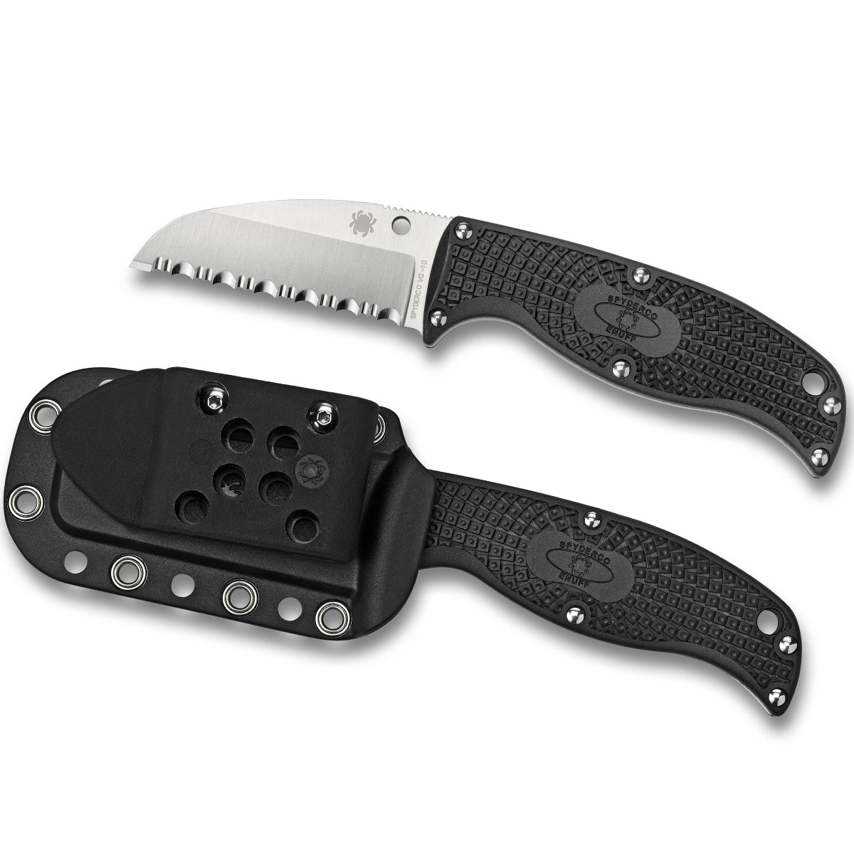 The sheepfoot Enuff is saber ground and features a straight SpyderEdge cutting edge that is ideal for safely cutting seat belts, webbing, rope, and similar materials in the high stress of a critical incident.