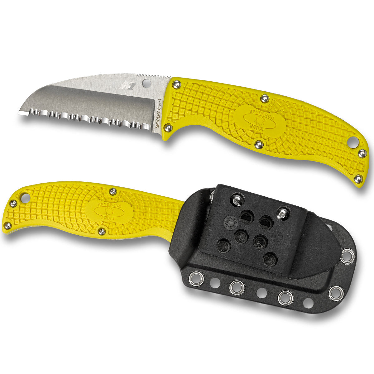 All Enuff knives feature skeletonized full-tang construction for strength and light weight and identical handle scales injection molded from durable fiberglass-reinforced nylon. The scales are contoured to provide a hand-filling grip and boast Spyderco’s signature Bi-Directional Texturing™ pattern. Since the H-1 Enuff is ideal for use around water, it features high-visibility yellow scales that make it easy to locate—even in murky water.