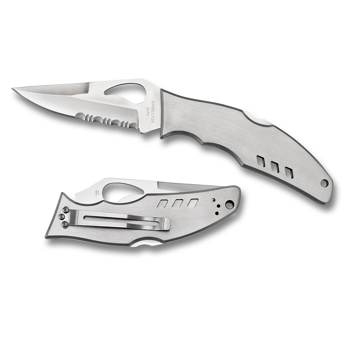 Byrd Knives are a species of knives produced and imported by Spyderco. The hollow-ground 8Cr13MoV blade is fitted with a "comet" shaped opening hole that is unique to byrd designs and represents a symbol of quality. Texturing crosshatches the blade's spine gripping the thumbprint for slip free cutting.