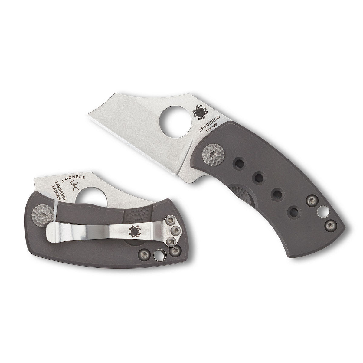 Based on custom knifemaker Jonathan McNees’ popular “Killer B” model, the ultra-compact Spyderco McBee™ proves that function is a matter of design, not size. Crafted from CTS® XHP, its saber-ground Wharncliffe blade offers both scalpel-like precision and impressive cutting power, as well as true one-hand-opening capability via its Trademark Round Hole. The stonewashed blade locks via a sturdy Reeve Integral Lock™ (R.I.L.) built into one of the handle’s two solid titanium scales. A right-side, tip-up pocket clip and a lined lanyard hole guarantee convenient carry, while stippled accents on the pivot screws and handle faithfully replicate McNees’ distinctive style.