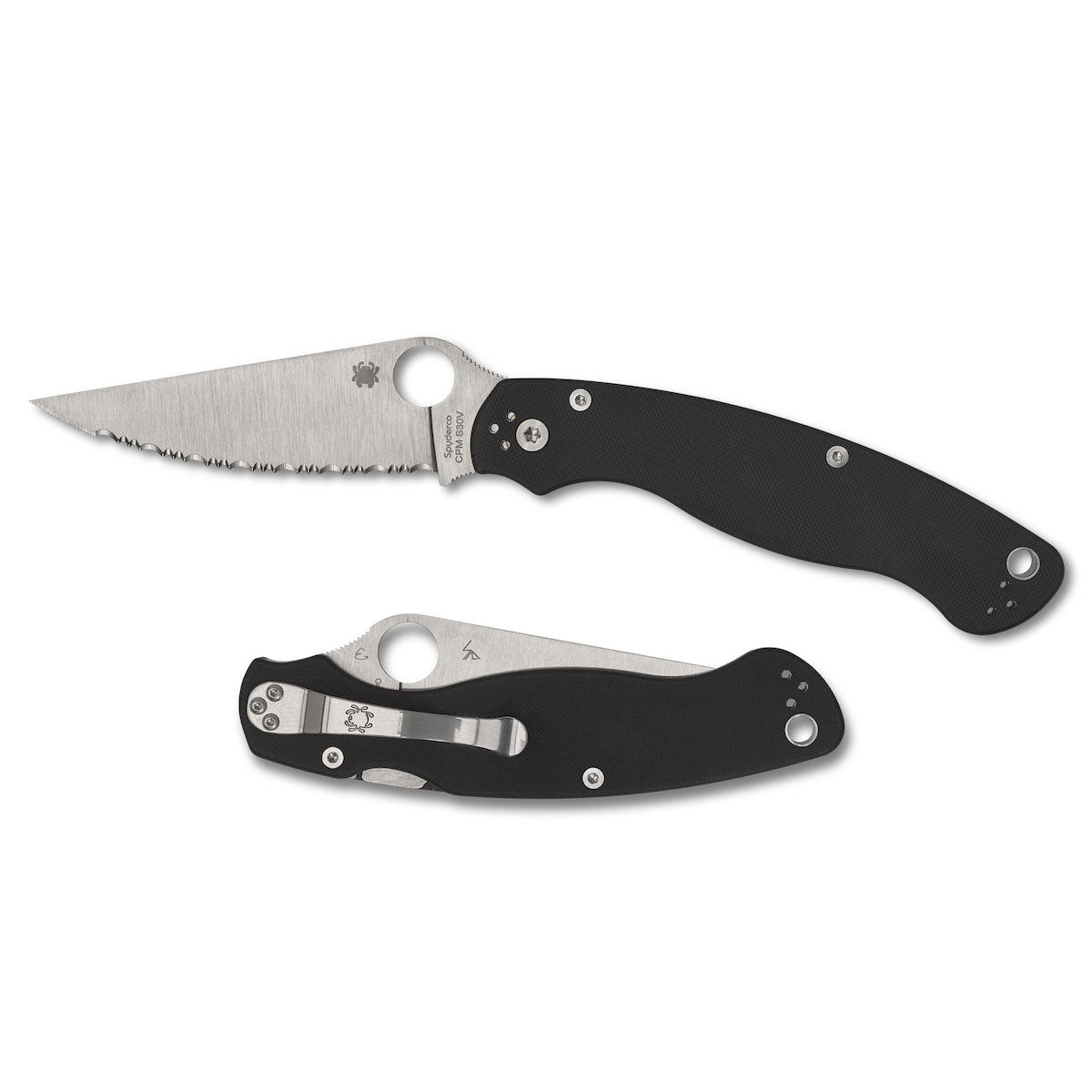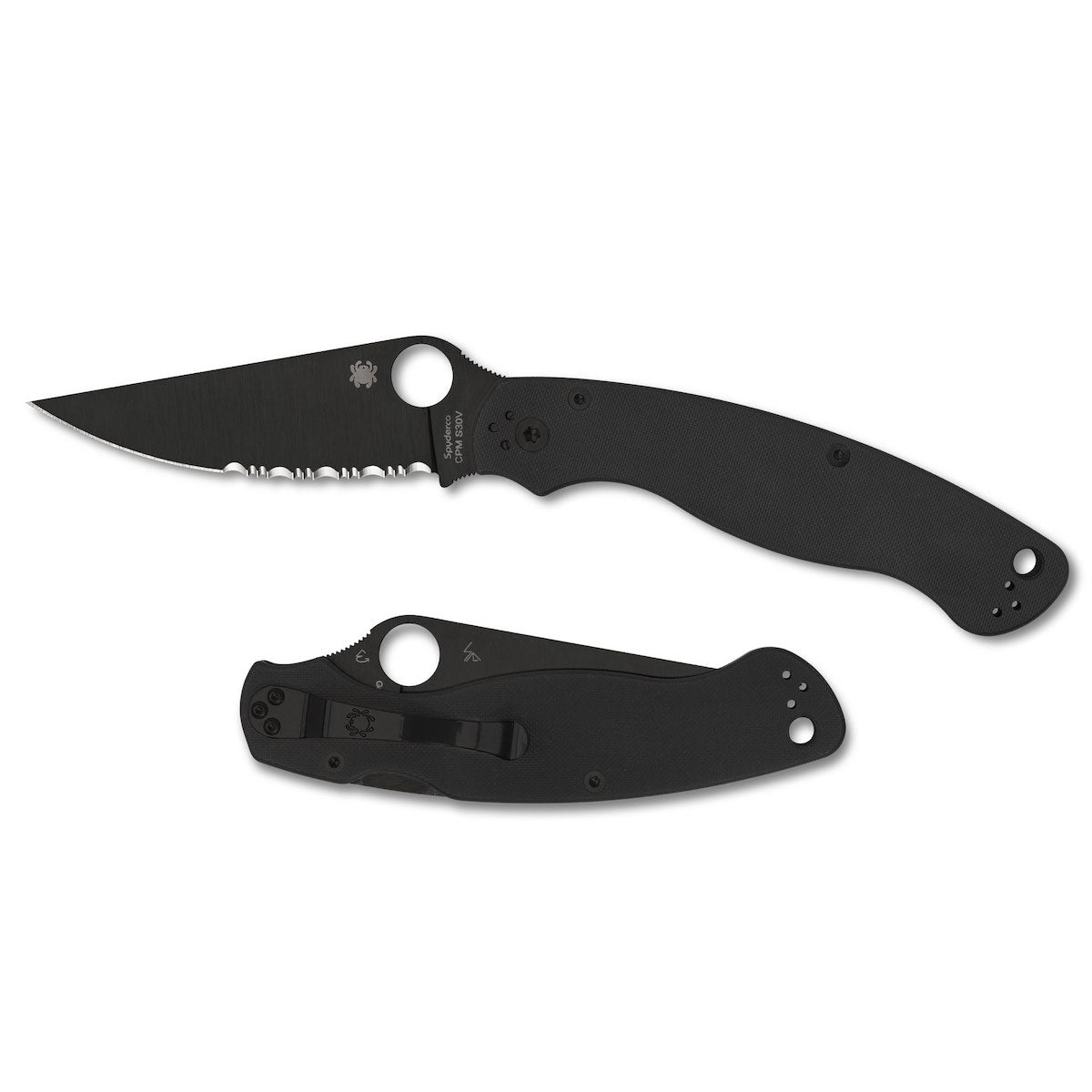 The Military 2 with CPM S30V blade steel is available in several different variations. The basic model features black G-10 scales, a satin-finished blade, brightly finished handle hardware, and a choice of PlainEdge™ and SpyderEdge™ formats. With a satin-finished PlainEdge blade, it is also available with digital camouflage peel-ply-texture G-10 handle scales. For those who prefer the look of a black blade, we offer the Military 2 in an all-black theme with a non-reflective Diamond-Like Carbon (DLC) blade coating, matching black-coated liners, clip, and handle hardware, and a choice of all three edge configurations. For the best of both worlds, there is also a version of the Military 2 that features a black DLC-coated PlainEdge blade, G-10 scales, and black-coated liners, clip, and hardware.