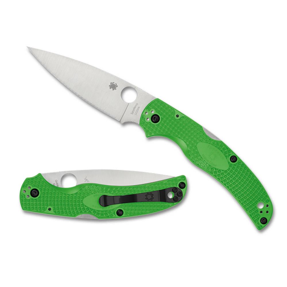 Twenty-one percent lighter than its G-10- handled counterpart, the Native Chief Lightweight features fiberglass-reinforced-nylon (FRN) handle scales and high-traction Bi-Directional Texturing. Those qualities made it an ideal candidate for inclusion in Spyderco’s remarkable Salt Series. This Native Chief Lightweight Salt showcases a full-flat-ground blade precision machined from ultra-corrosion-resistant LC200N steel, best known as NASA’s material of choice for ball bearings in spacecraft. Available in both PlainEdge and fully serrated SpyderEdge formats, the blade is paired with a linerless handle injection molded in the signature high-visibility green color of our LC200N lightweight Salt family. The vibrant handle also houses the knife’s sturdy back lock mechanism and includes four sets of threaded inserts to allow fully configurable mounting of a four-position pocket clip.