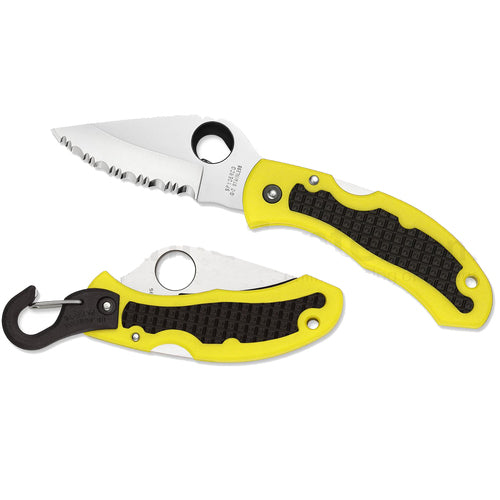 The Snap-It Salt features a broad, hollow-ground blade with an oversized Trademark Round Hole™ for exceptional leverage during right-handed one-hand openings. Available in either a PlainEdge™ or SpyderEdge™ format, it is paired with a high-visibility handle injection-molded from bright yellow fiberglass-reinforced nylon (FRN). The handle houses a stout back lock mechanism that locks the blade securely open and textured black Kraton® panels for a secure grip, even when wet. The knife’s steel-reinforced FRN shackle features a spring gate that, like the other components of its screw-together construction, is also extremely corrosion resistant.